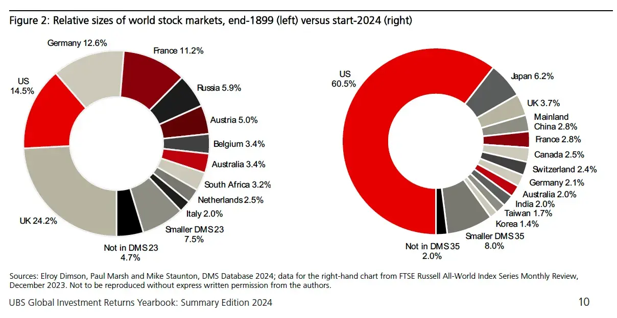 Интересный материал из Global Investment Returns Yearbook 2024 от UBS, посвященный соотношению фондовых рынков разных стран на протяжении 124 лет. Далее - перевод главы из исследования: